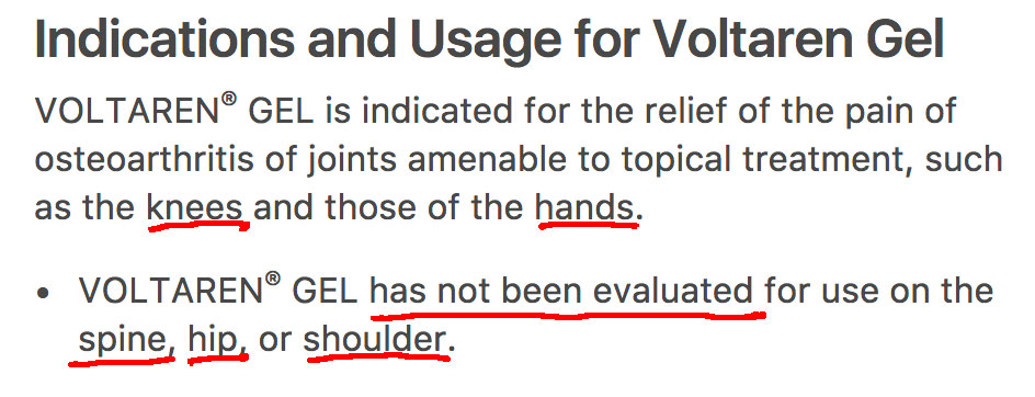 Проте на американських сайтах можна знайти чітке визначення до застосування Вольтарен гелю. Згідно інструкцій на сайті FDA та Drugs.com, показанням для застосування гелю Вольтарен є тільки болі у колінах та руках. Використання гелю у суглобах хребта, стегна, та плеча не було досліджено: