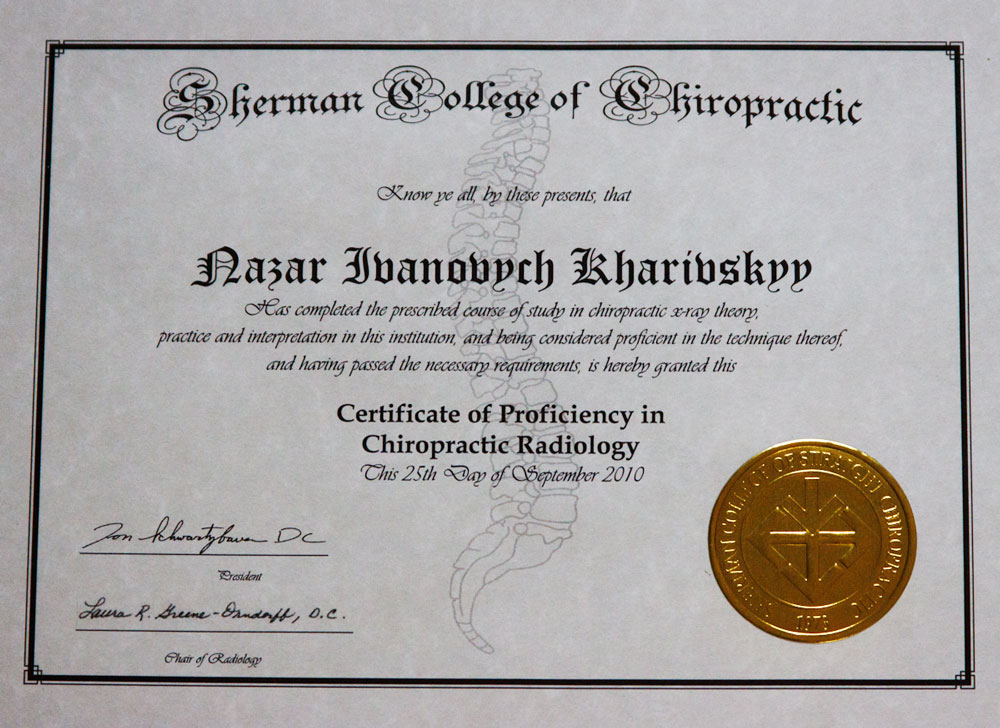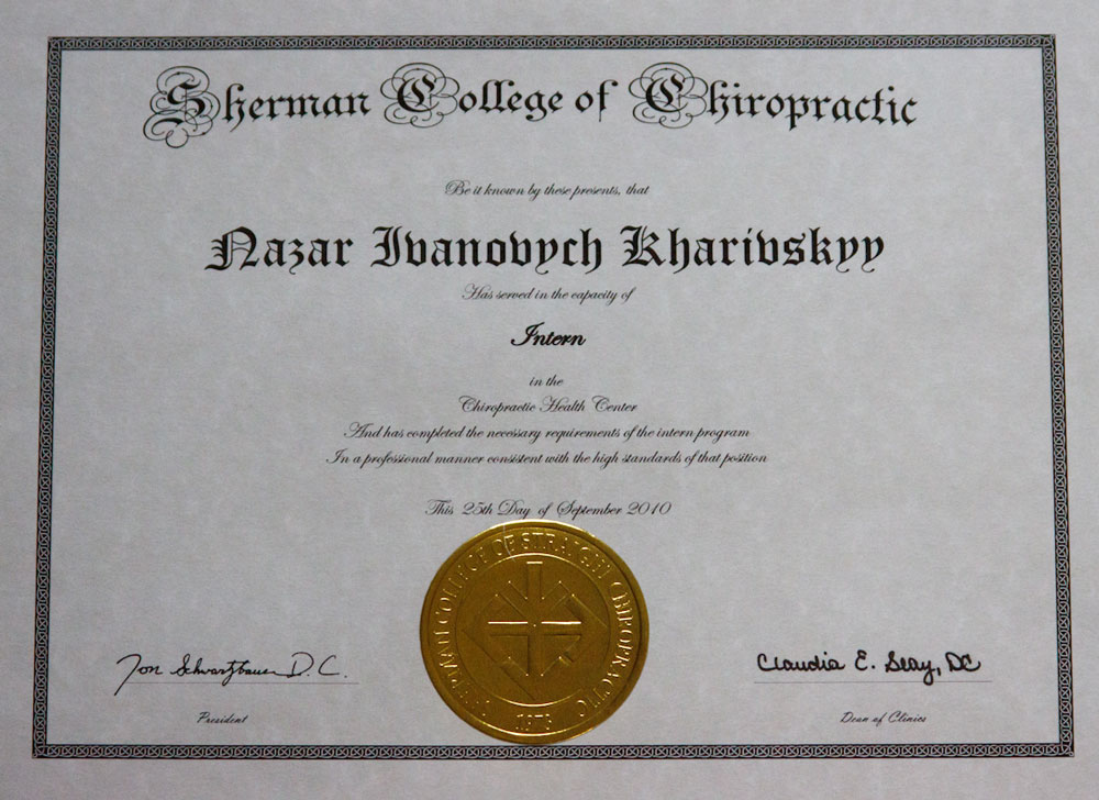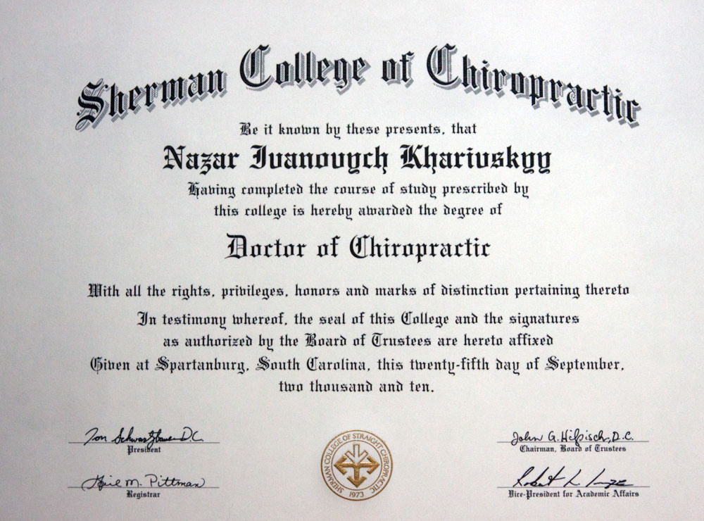 Диплом "Доктор Кайропрактики" - приватний коледж кайропрактики ім. доктора Шермана, штат Південна Кароліна, США.