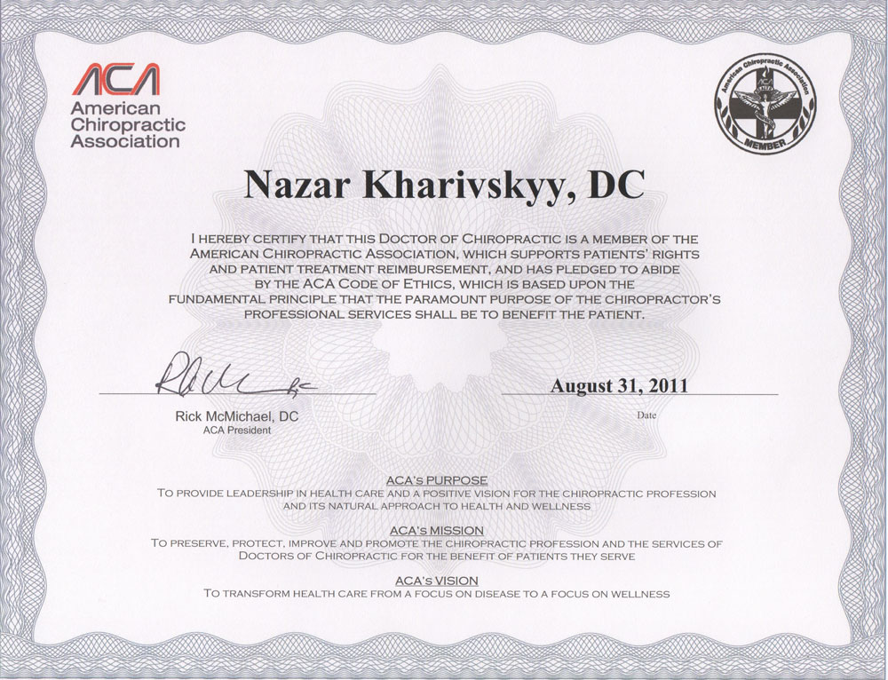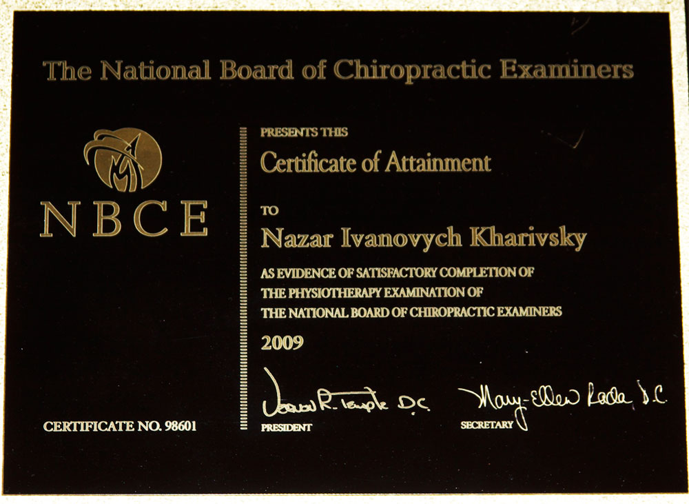 Сертифікований Національною Радою Екзаменаторів з Кайропрактики, США.